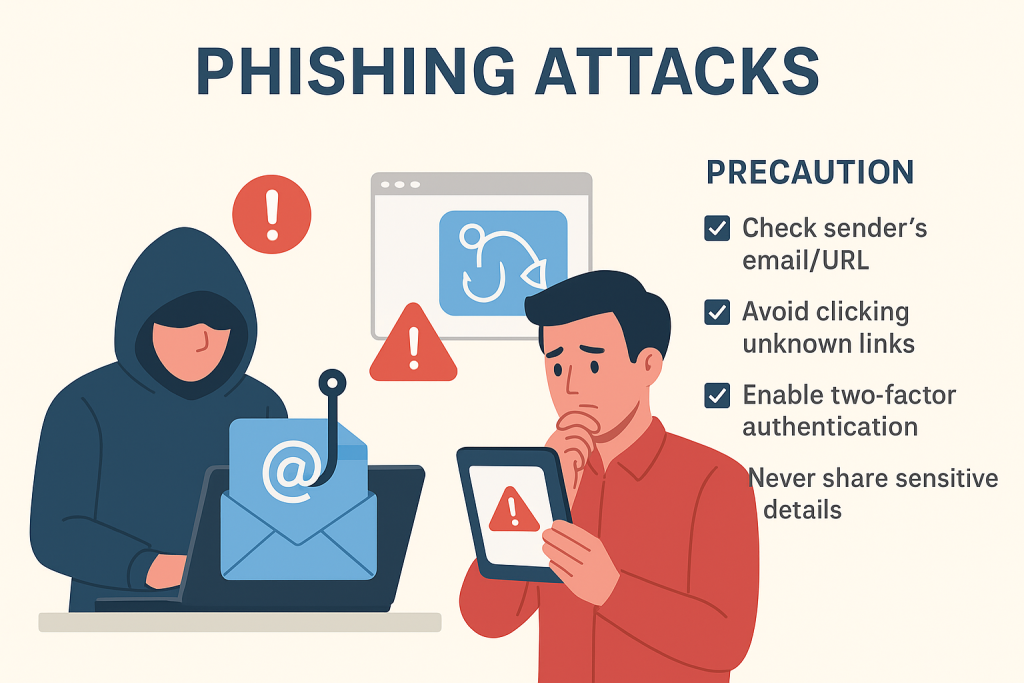 Phishing attacks are one of the most common forms of online fraud, where scammers pretend to be trusted organizations like banks, e-commerce sites, or even your office. They usually send emails, SMS, or WhatsApp messages containing fake links that look real. For example, you might get an email saying, “Your bank account is blocked. Click here to verify.” Once you click and enter details, the fraudster steals your login credentials.