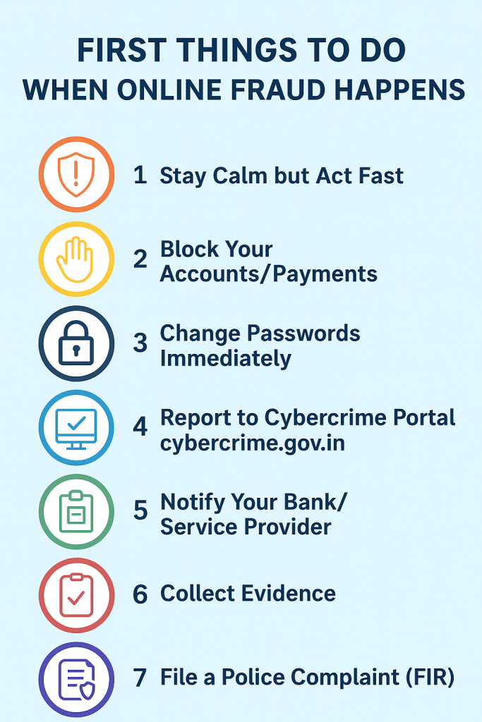 - Report cyber fraud to cybercrime.gov.in or your local cyber police